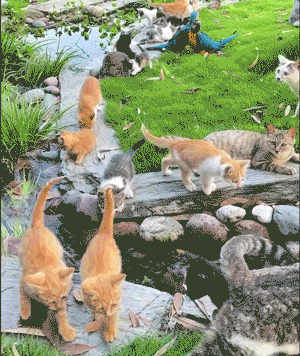 I wish I could learn more about the backstory on this video. It’s possible that it is showing the Lanai Cat Sanctuary in Hawaii, but I can’t be sure and I couldn’t find any visual confirmation of this particular water feature. In any event, it’s parrots and puddies, having a party. Seems like a pretty rockin’ time!