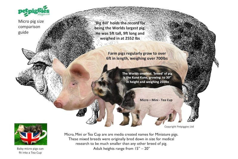 While there’s no denying that mini pigs are super cute, be aware that choosing one for a pet is a huge commitment. While they are indeed likely to be smaller than other breeds of farm pigs (assuming the breeder is a reputable one), they still can get quite large. A standard mini pig ranges from 35 to 50 cm tall and can weigh between 50 and 150 pounds when fully grown. But any pig that weighs less than 350 pounds is considered a “mini pig.”