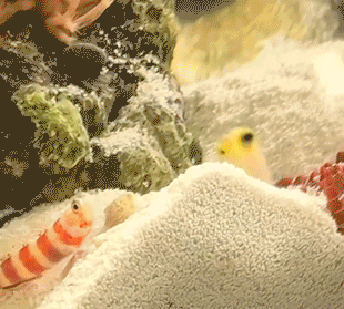 I’m pretty sure, based on shape and coloration, that these are goby fish. Many species in this group are sand sifters, taking in mouthfuls of sand to filter out food and then expelling the non-consumable bits. They can be helpful residents of an aquarium because they keep the substrate clean, redistribute microfauna, and prevent the buildup of toxic gasses by disrupting hydrogen sulfide pockets. The sifting process, as detailed by aquarium supply company Manta Systems, entails several steps: