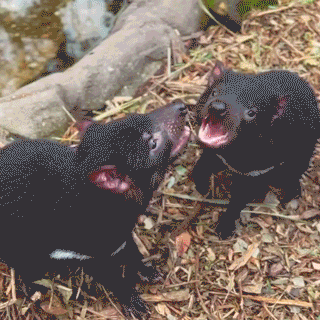 Today’s gif has a couple of young Tasmanian devil pups play fighting and generally being their loud and proud selves. These little guys love to vocalize. It’s a skill that they will need as they navigate their social interactions later in life. Adults use vocalizations to communicate, particularly when they particulate in group mealtimes. While devils were once considered solitary and combative, research has shown that they do live in distributed social networks and females in particular are not aggressively territorial beyond defending their young.