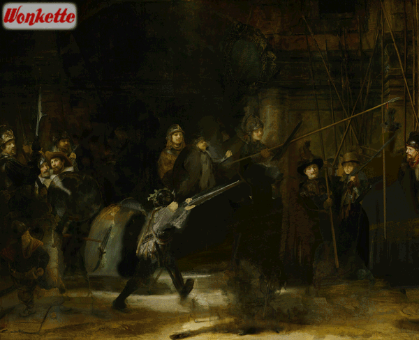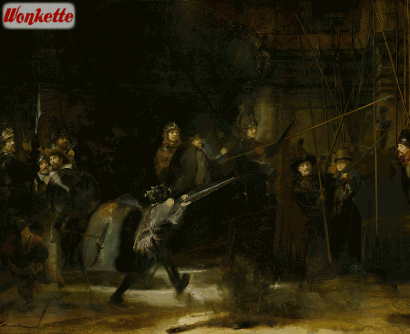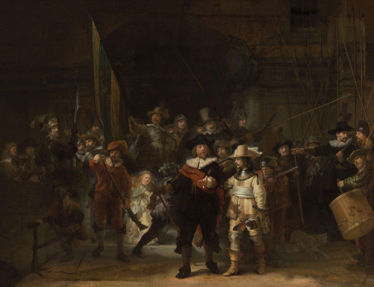 Today you see me having a bit of fun with the 1642 painting “Militia Company of District II under the Command of Captain Frans Banninck Cocq,” a.k.a. “The Shooting Company of Frans Banning Cocq and Willem van Ruytenburch” by Rembrandt van Rijn. Most people know this masterwork under its popular title “The Night Watch.” In actuality, the painting is set during the day, depicting the company ready to deploy. However, as the painting aged, the layers of varnish darkened, leading to a mistaken impression that the painting shows a night watch, hence the popular, if inaccurate, moniker