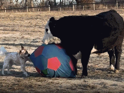 When Buddy the bull first came to his forever rescue farm, he was a little timid. But Tilly the dog just knew they’d be fast friends. She and her humans worked on getting Buddy over his shyness, and after a few weeks of TLC, Bruno came to understand he was safe and began to ease into his new life. The two interspecies pals were finding ways to be together for cuddles and kissing. But their friendship really blossomed when the farm provided a giant ball for the two of them to play with. They now have regular games where they shove, nudge and chase their sports sphere. Bruno is kind of a ball hog, finding ways to pin the ball to keep Tilly from running off with it. But I think secretly he loves his energetic playmate’s zoomies, even if he can’t quite keep up for too long. He’s got to have a rest for chewing his cud, after all. Come on Tilly, it’s time for a water break!